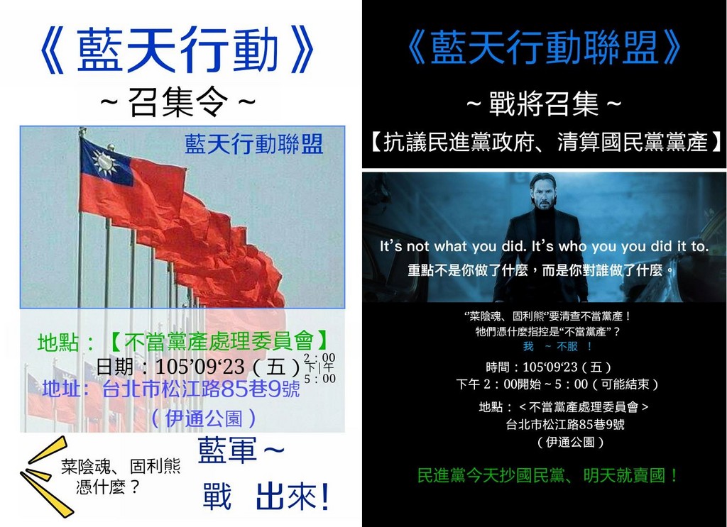 據了解,「藍天行動聯盟」剛成立不久,為了抗議民進黨清算國民黨黨產,23日14時至17時將集結在不當黨產處理委員會前,大聲抗議「民進黨政府鴨霸、清算國民黨黨產,是可忍孰不可忍」,同時還準備好口號「顧立雄不要臉!蔡英文不要臉!蔡英文不要臉!國民黨黨產都在,民進黨黨產都A回家了!」