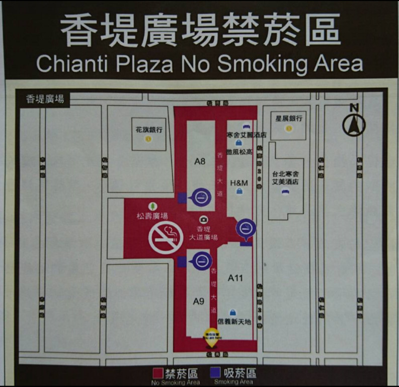 「香堤廣場」禁菸區範圍為松高路、松智路、松壽路及松高路20巷間的區域,包括香堤大道、香堤大道廣場、松壽廣場,以及新光三越百貨台北信義新天地A8館、A9館、A11館之1樓騎樓及地下1樓出入口周邊、微風松高之1樓騎樓及面松高路門口之前方廣場、寒舍艾麗酒店面松高路門口之前方廣場、及實施禁菸措施區域內之周邊人行道(不含松高路20巷之人行道)。另外,A8館、A9館、A11館共設有3個吸菸區,除3處吸菸區外全面禁止吸菸。