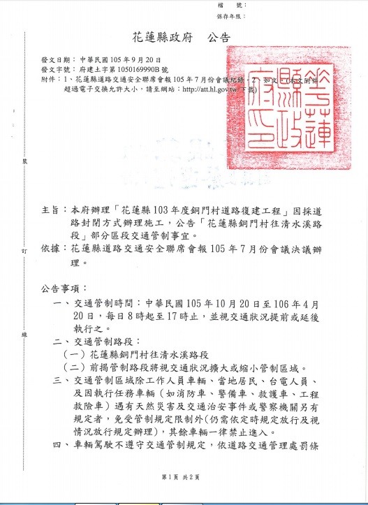 ▼ 花蓮縣政府公告慕谷慕魚道路修復公文。(圖/花蓮縣政府提供)