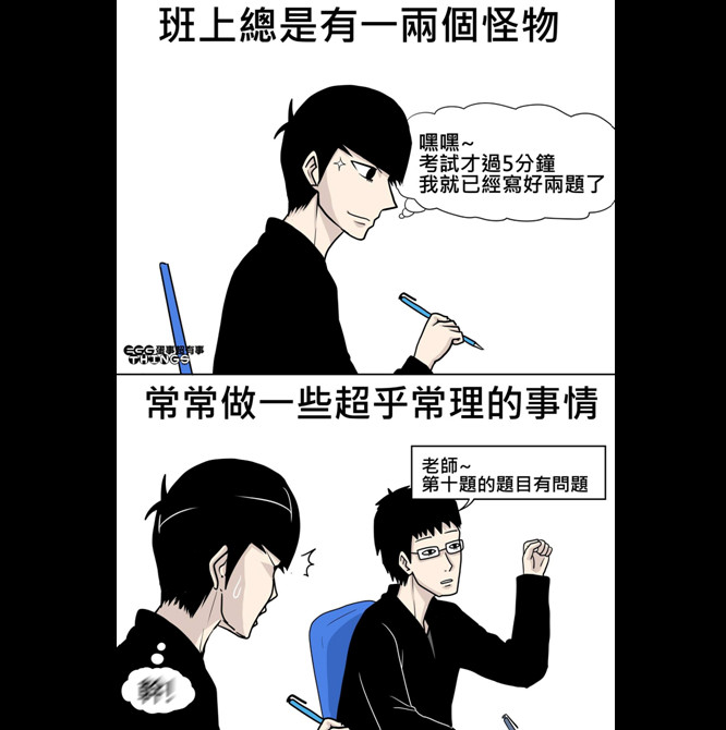 圖文中,一名男同學在考試時心想「嘿嘿~才過5分鐘,我就已經寫好2題了」,正當他沾沾自喜,覺得自己還滿厲害時,隔壁的眼鏡男突然舉手發問「老師,第10題的題目有問題」,讓他嚇得心慌慌「X!」,班上總是會有一兩個怪物,常常做出一些超乎常理的事情。