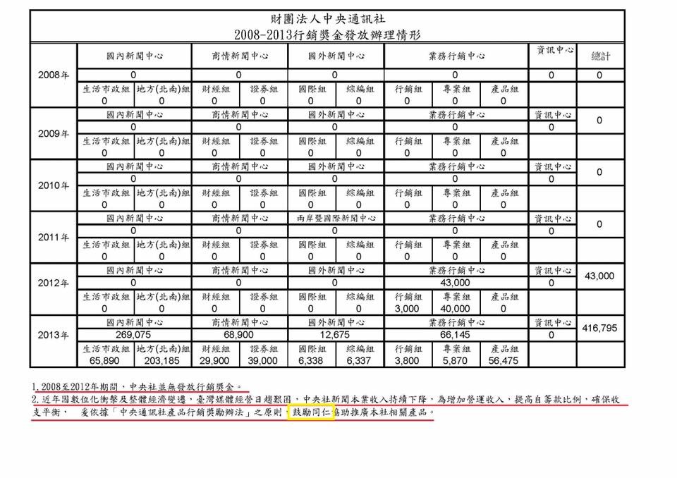 不過,段宜康則拿出中央社「行銷奬金」發放統計回擊,資料中註明2008到2012年間,中央社的新聞部門沒有發過行銷獎金;連業務行銷中心,也從2012年才開始發獎金。「2011年,中央社發生什麼變化,突然對拉廣告積極起來?沒別的,就因為來了個熱騰騰的新董事長,叫陳國祥。」