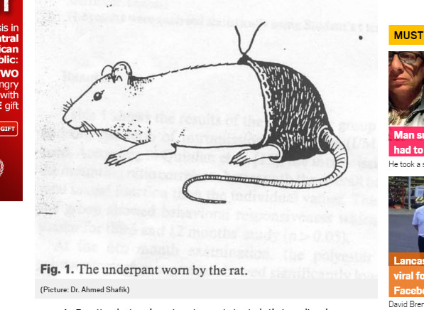 內褲材質影響性慾,老鼠可說是小兵立大功啊!2016年「搞笑諾貝爾獎」22日(美東時間)在哈佛大學舉辦。其中「生殖學獎」由已故學者沙菲克(Ahmed Shafik)獲得,他替75隻老鼠穿上不同材質的內褲,發現特定材質會導致老鼠性慾下降,並認為此結論也適用於人類。