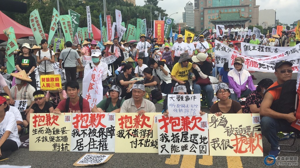 「新政百日、迫遷依舊、土地正義、重返凱道」惜根台灣協會、反迫遷連線、台灣人權促進會、經濟民主連合及全台各反迫遷自救會等超過60個民團25日走上凱道怒吼,並高舉「抱歉!生而為雞蛋,不該與高牆對抗」、「身為被迫遷戶,我很抱歉」等標語;已遭拆除的張家藥房老闆遺孀彭秀春呼籲,各地政府徵收與迫遷,必須是最後不得已手段,衷心盼望經過這週末,各級政府都能重新回頭檢視手上個案,莫讓大埔悲劇在蔡政府領導下再重演。