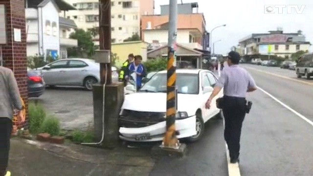 ▲黃男駕駛的白色轎車撞上電線桿。(圖/東森新聞)