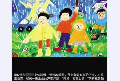據《重慶晨報》報導指出,鄭女士帶女兒到一家培訓機構上塗鴉體驗課,由於路上塞車,她們到遲到了20分鐘,培訓機構的老師建議她們放棄這堂課,因為這時進去會打擾正在上課的孩子和老師,此外,課已經上了一半,孩子進去有一些沒聽到,會影響學習的效果和興趣。
