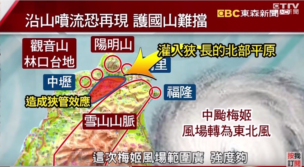 什麼是沿山噴流?以此次中颱梅姬為例,風場圖顯示會颳起北風,與南北走向的中央山脈幾乎平行,也就是說,中央山脈完全失去阻擋能力,反而還會加劇強風肆虐。梅姬接近台灣後,強風會從東北角吹入,到台北盆地地區時,由於西北側有陽明山、觀音山,東側又有中央山脈,因此形成一處較低且狹長的地形,有助於風力能量的累積,屆時颳起的「沿山風」強度不容小覷。