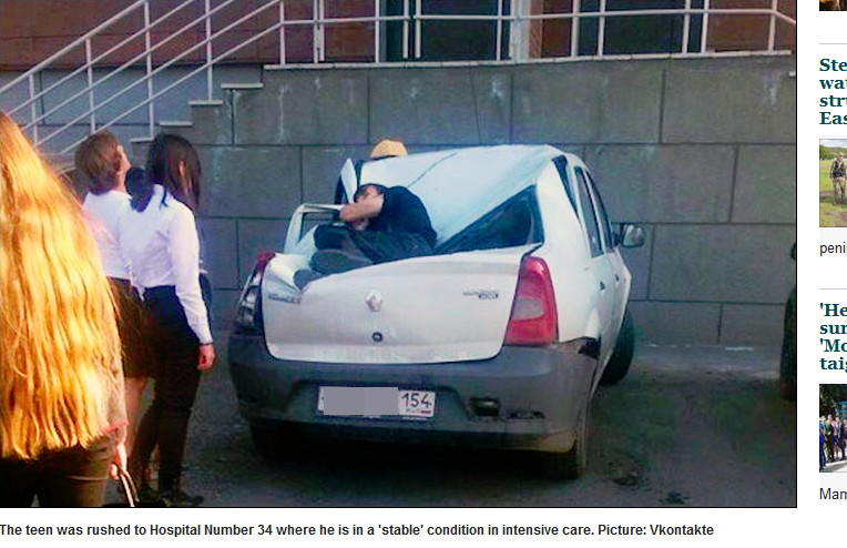 俄羅斯西伯利亞地區一名16歲少年,為了取悅心儀女孩,吸引女孩子注意,竟爬上23樓陽台外牆,結果沒有抓緊扶手失足墜樓,摔到一輛汽車上,他雖然身受重傷,但卻奇蹟似撿回一命。
