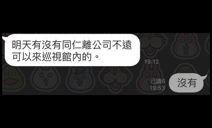 「爆料公社」粉絲專頁轉貼黃姓社員的PO文內容,他公開一張公司的Line群組截圖,只見颱風來襲、各地放假,主管26日晚間先詢問「明天有沒有同仁離公司不遠可以來巡視館內的」?沒想到他竟代替所有員工回答,「沒有」!
