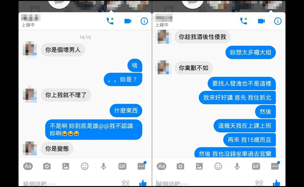 陳姓女子接著繼續罵,「你趁我酒後性侵我」、「你禽獸不如」。碰上不知名正妹亂咬,吳男相當無奈,只好強調自己住新北市,平常都要上班、上課,自己更只是15歲的男孩,「然後,我也沒錢坐車過去宜蘭,所以,你繼續這樣毀謗請自重。」