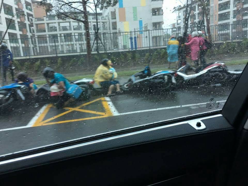 原PO貼出照片寫道,「高雄下課實況」;照片中,在一間學校旁邊,至少5輛機車被吹倒,3名騎士跌坐在地,其他人則站在一旁的人行道上,有人抱著一顆樹木,被風雨吹得十分狼狽。