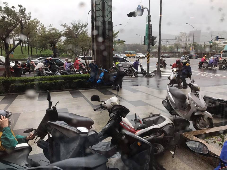 27日下午,各地紛紛傳出災情,許多高雄人都在網路上貼出風強雨大慘狀,有一整排停放好的機車直接被強風吹倒,也有機車騎士只是在馬路上停等紅燈,就被風吹倒,一旁的警察一下要指揮交通、一下又要協助騎士起身,陣陣強風卻又把人吹得難以行走,畫面宛如「大逃難」。