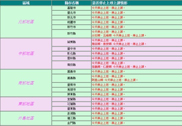 梅姬颱風襲擊台灣,27日晚間大多數縣市首長都宣布28日停班停課,但仍有包括花蓮縣、台東縣、新竹縣、苗栗縣和南投縣這5縣市,原本是宣布28日要上班上課。不料深夜11時過後,這些縣市全都改宣布停班停課,因此台灣本島和離島所有縣市,28日全都是停班停課的狀態。