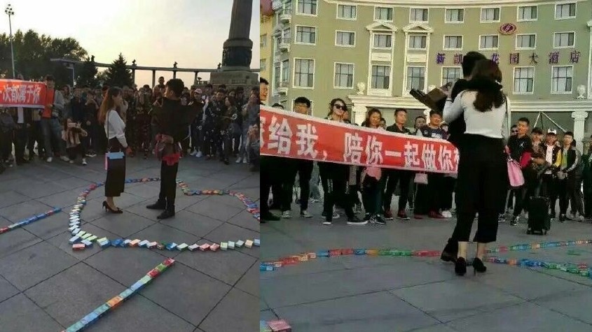 據瞭解,事情發生在9月25日哈爾濱的中央大街上,男子在路上用999盒各式各樣的保險套排成的愛心,女方則在好友的誘騙下來到現場,男方緩緩地走向女方,並牽起她的手走進愛心,接著單膝下跪,送上丁字褲「玫瑰花」示愛,一旁的親友則是拉著布條助陣。
