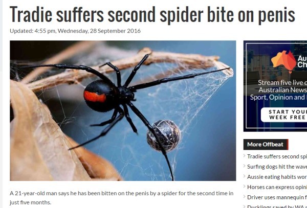 這不知道該說是幸運還是倒楣了!澳洲一名男子喬丹(Jordan)日前在一處流動廁所上大號時,「命根子」遭到蜘蛛咬傷,他當場痛得大叫;只是他在5個月前,那話兒同樣也被蜘蛛咬傷,讓他直呼太扯了。
