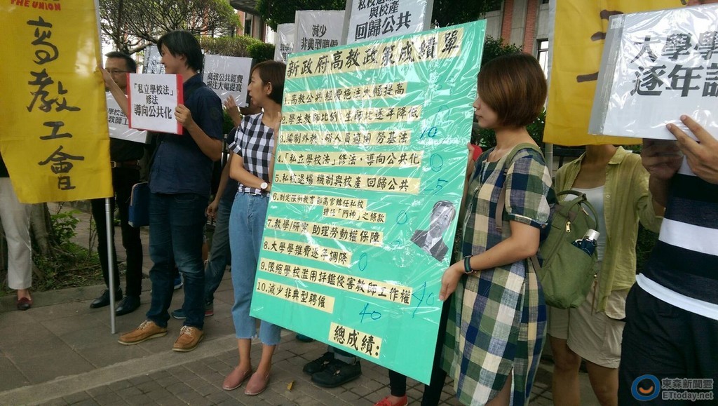 高教工會給教育部的評分,在生師比、私校法修法、私校門神條款、研究助理勞動權保障、大學學雜費調漲等5個項目的分數都掛零。工會表示,工會過去不斷提出「高教公共化」、「降低生師比,確保教學品質」、「私校退場過程保障師生權益,校產回歸公共」、「私學增設公益董事與勞工董事」、「學生兼任助理勞動權保障」等改革訴求,新政府仍無具體回應。許多部分更是延續國民黨的政策方向,例如拒絕大幅增加高教經費、維持惡化大專生師比、放任私校不正辦學、容許大學濫用教師評鑑、縱容學生助理勞權遭侵害等。