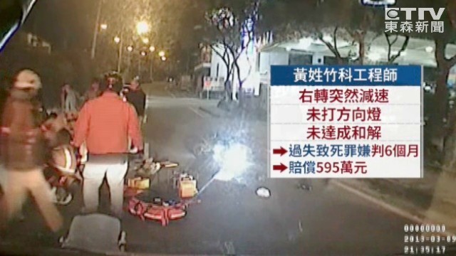 黃姓竹科工程師2年前開車行經新竹寶山路時,突然右轉要進加油站,詹姓騎士閃避不及撞上,慘遭另一輛轎車輾斃;法官審理後認定,黃男不但突然減速右轉又沒有打方向燈,是肇事主因,判刑6個月,必須賠償死者家屬595萬元。