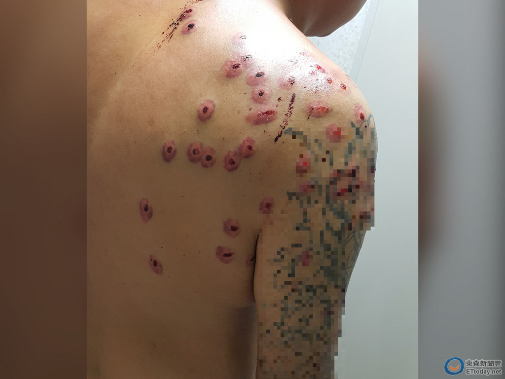 ▲劉姓男子遭BB彈射擊凌虐,全身就像佈滿「彈孔」。(圖/記者楊佩琪翻攝)