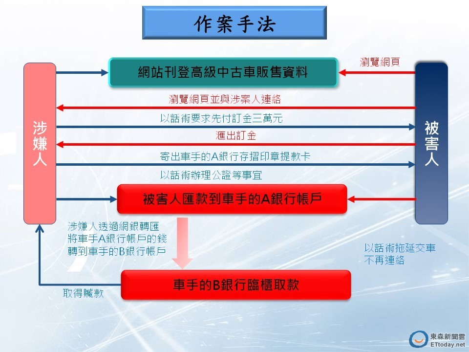 刑事局表示,這群詐騙車手使用的手法有一定模式,像是日前一名林姓男子在知名中古車買賣網上,看中一輛BMW休旅車,只要90萬元。林姓男子立刻和賣家聯絡,賣家要林男先匯入3萬元訂金,接著就把印章、存摺交給林姓男子,要他把剩餘款匯入,林姓男子不知道,賣家根本是詐騙車手。