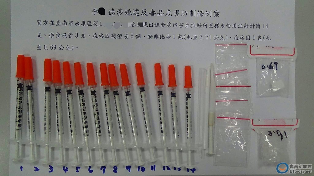 ▲台南市麻豆警方不畏強風暴雨,颱風天逮販毒鴛鴦,起獲海洛英、安非他命毒品、注射針筒一批。(圖/警方提供)