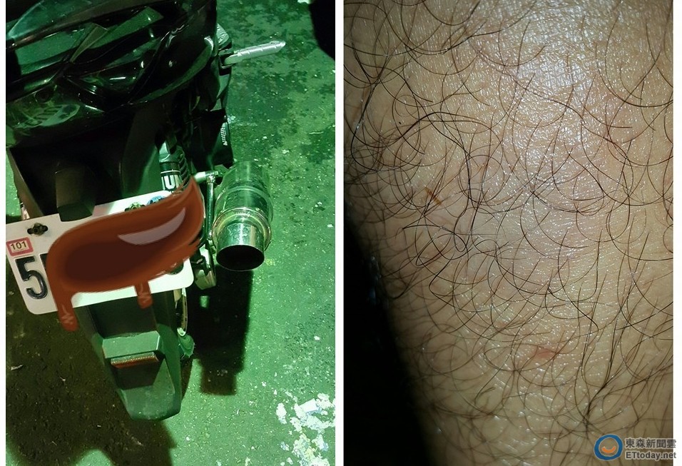 彰化網友小祐在臉書「爆廢公社」PO文表示,29日出門準備要去牽車,翻開車罩的同時突然感到小腿肚一陣劇痛,回頭一看才發現,停在旁邊的機車改了一支大大的白鐵管又沒裝防燙蓋,超高溫的排氣管就這麼貼在他的腳上,小祐憤怒地說「你改怎樣那是你的事,但有沒有想過,其他人可能因此受傷?」