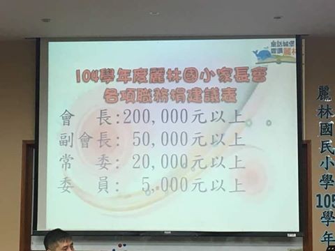 國內各學校普遍都有設置家長會,有網友在臉書《爆料公社》中貼出照片表示,新北市麗林國小在會議簡報上,直接明定出家長會長、副會長及委員等各項職務捐款「建議表」,價格由新台幣5000元到20萬元不等,原PO感嘆「千金難買家長會」,引發支持反對兩派網友熱論。
