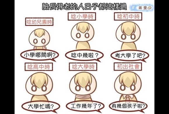圖文中,老臉人從念幼稚園時就被誤認成小學生;上小學後,被問「念中幾啦?」到了初中,被問「考大學了嗎?」念到高中,又變成「大學忙嗎?」大學後則被問「工作幾年了?」最後終於出了社會,問題馬上晉升成「有幾個孩子啦?」真實年齡永遠趕不上外貌年齡,著實讓人困擾。