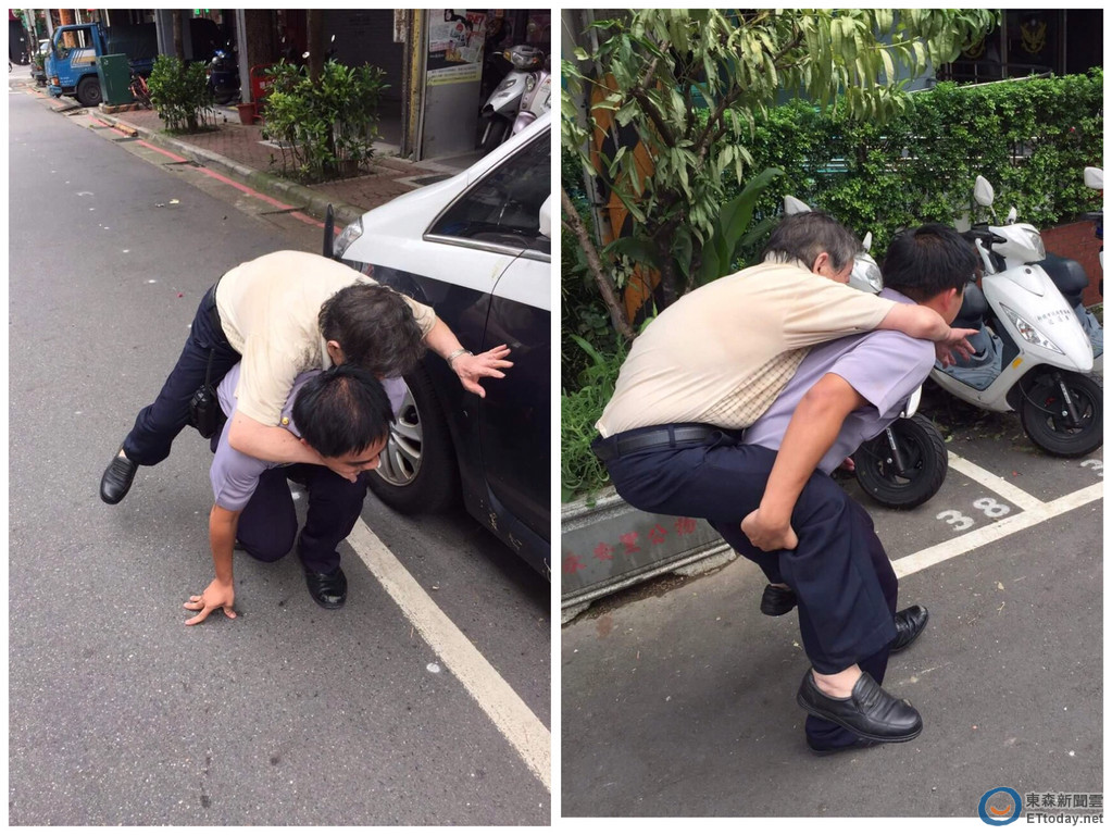 新北市一名孫姓老翁上個月29日中午疑似身體不適,倒臥在永和區福和路自由路路口,永和派出所員警獲報前往查看,發現老翁臉色脹紅,手腳發軟盜汗,似乎是中暑症狀,二話不說,員警揹起老翁,一步步走回派出所,不少路過民眾大讚真暖心。其實該名員警日前腳踝骨折還沒痊癒,忍痛揹著老翁,連同仁看了都不捨。