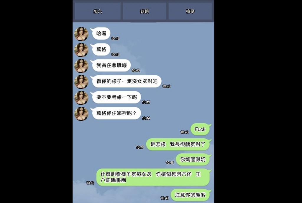 詐騙集團可以這樣羞辱人嗎?文姓網友在臉書爆廢公社PO出一張照片,表示LINE突然收到陌生訊息,看照片還是位「爆乳美女」,但對方劈頭就說「葛格,我有在兼職喔,看你的樣子一定沒女友對吧!要不要考慮一下呢?」令他看了直接爆氣怒回「什麼叫看樣子就沒女友?」