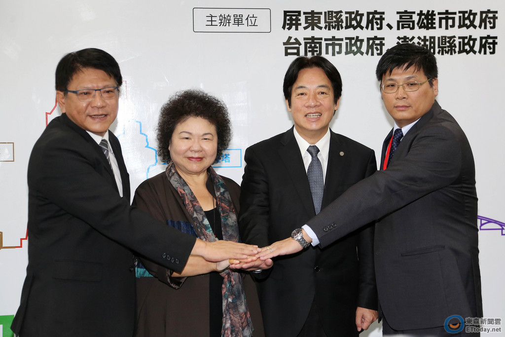 ▲台南市長賴清德,出席由屏東縣主辦的南高屏澎區域治理平台會議,與屏東縣長潘孟安、高雄市長陳菊以及澎湖縣副縣長林皆興,希望透過共同協力,創造繁榮。(圖/市府提供)