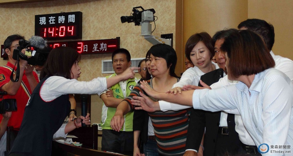 ▲台南市議會代理議長郭信良宣布補選投票後,國民黨蔡淑惠等人衝上主席台理論,與民進黨議員發生衝突。(圖/記者林悅翻攝)