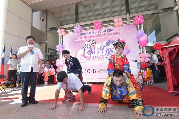 ▲預演的新郎以伏地挺胸載著美嬌娘。(圖/桃園市政府提供)