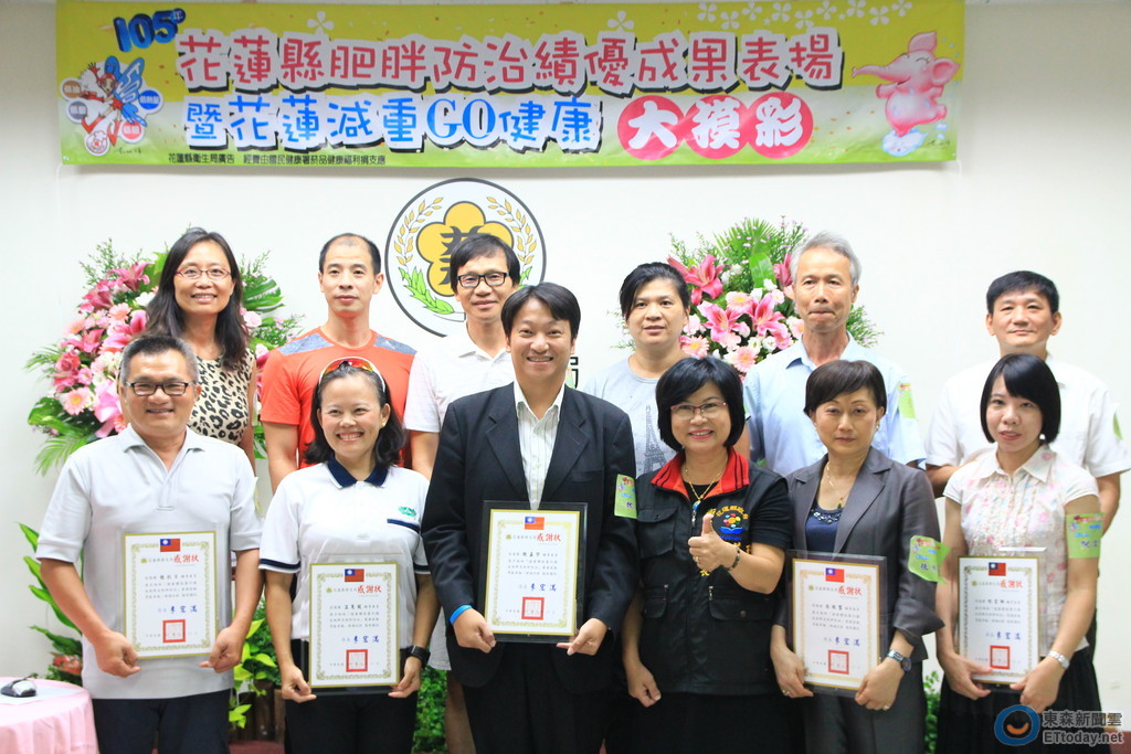 花蓮縣推出集體減重,105年再度蟬聯率全國之先達陣殊榮,今年總計有8119位民眾參與,共計甩油20,279.9公斤,特別於4日針對績優減重職場與勞苦功高的減重輔導委員頒發感謝狀,場面簡單隆重、溫馨感人,顯見花蓮鄉親對健康的重視已造成風潮,為花蓮縣劃下美好的健康減重推動歷程。