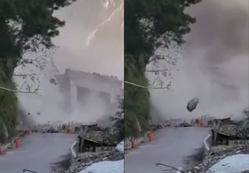 「爆料公社」臉書粉絲專頁分享影片,有民眾在現場拍下整個山崩過程。剛開始是一些較小的石塊陸續掉落,接著從約17秒開始,大量土石一口氣從山坡上崩落,頓時一陣天搖地動,相當嚇人。