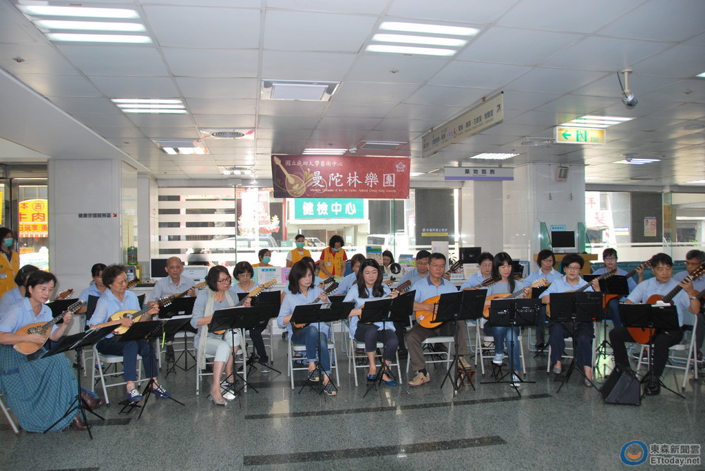 成大藝術中心曼陀林樂團,5日上午9時在郭綜合醫院一樓大廳演奏,用優美的節奏陪伴病友看病,吸引無數的病患及家屬駐足聆賞,獲得熱烈的掌聲鼓勵。教師退休的李慕發夫婦昨天連袂回診時, 巧遇大廳的這難得音樂演出,認為藝術注入醫院的安排,可讓受病痛所苦的傷患感到更愉悅。