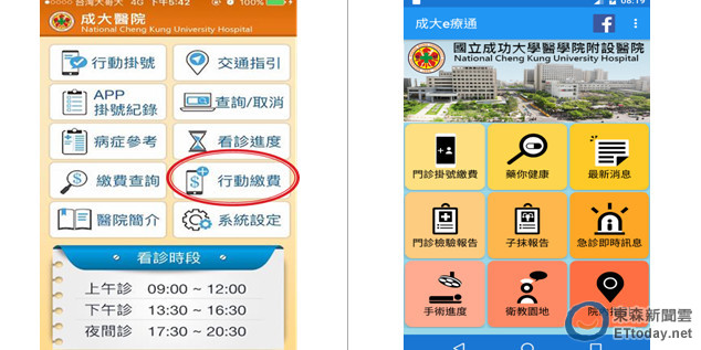 另配合民眾使用智慧型手機等行動裝置愈來愈普遍,成醫開發2項行動APP提供民眾使用,包括「成大掛號繳費」及「成大e療通」。「成大掛號繳費」APP,包含行動繳費、預約掛號及提醒、掛號紀錄查詢、病症參考查詢及看診進度查詢等等功能。