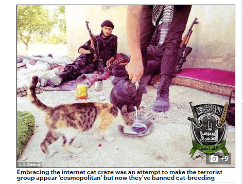 根據《每日郵報》報導,伊斯蘭教資深傳教士日前做出裁決,根據伊斯蘭法,聖戰士們禁止養貓;當局將逐戶調查、捕捉小貓。不過許多戰士都是貓奴,他們常在社交網站上曬貓照,這些照片一度成為拉攏各國志願者的宣傳品,根據聯合國統計,2014年共有來自80國、1萬5千名「貓奴聖戰士」加入。