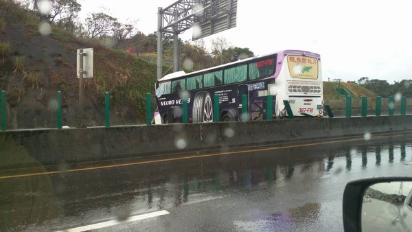 ▲國光客運疑似自撞指示牌,整輛車打滑橫跨在台62線路中央。(圖/翻攝臉書爆料公社)