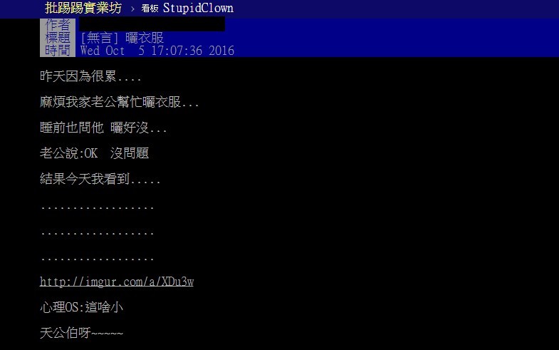 ▲人妻請老公幫忙曬衣服...下場太慘。(圖/PTT,本文已獲網友同意,下同)