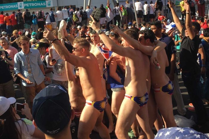 9名澳洲人上周日(2日)到雪邦(Sepang)觀賞「一級方程式賽車大獎賽」(Formula 1 Grand Prix)馬來西亞站的賽事。為了慶祝澳洲車手芮奇亞度(Daniel Ricciardo)贏得此一分站冠軍,他們得意忘形之餘竟然當著數千名現場觀眾面前脫掉衣服,只穿著印著馬來西亞國旗圖案的泳褲露天開趴對。還把鞋子當作杯子拿來裝啤酒喝。