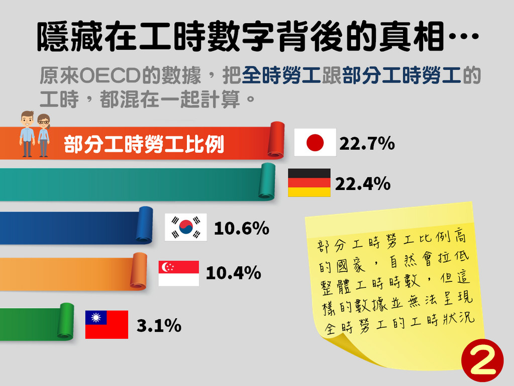 只是如針對各國工時結構及統計數據進一步分析, OECD之前開數據是將「全時工作者」與「部分工時工作者」合併統計。如果仔細探究OECD各國部分工時工作者比率,不少國家動輒都占20%以上,如日本22.7%,德國22.4%,英國24%;鄰近的韓國及新加坡也都有10以上%,反觀我國部分工時工作者比率僅3.1%,也就是由於部分工時工作者比率較其他各國明顯為低且差距懸殊,在統計全體受僱者全年工時時,結構上必然較高於其他國家。