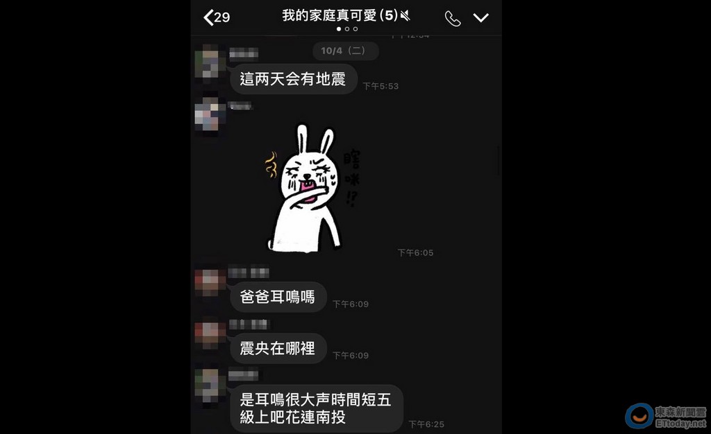 攤開對話紀錄,早在10月4日下午,爸爸就已在LINE群組裡面鐵口直斷「這兩天會有地震」,接著有人詢問「爸爸耳鳴嗎?」、「震央在哪裡?」爸爸也依據耳鳴情況分析「是耳鳴很大聲、時間短,(震度)五級以上吧,(震央)花蓮南投。」