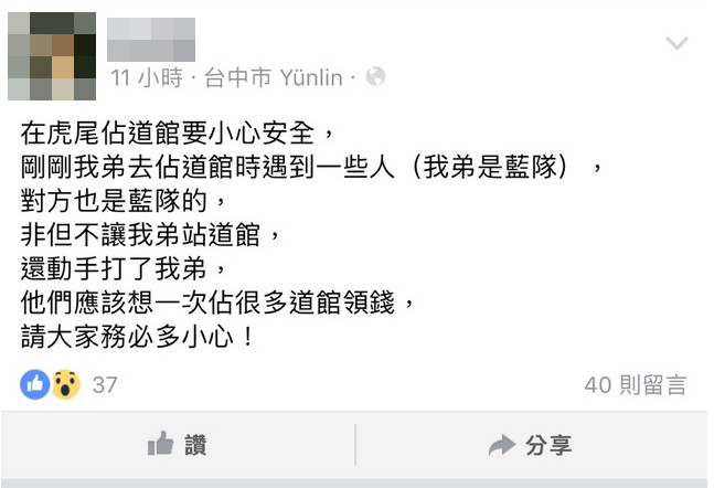 網友還補充,弟弟一開始去的是虎尾圓環,碰壁後轉去雲林故事館,結果又遇到同一批人,顯然不是巧合;最後,他的弟弟被對方怒打一下,道館沒得打,也只好趕快離開,來不及記下車牌號碼。