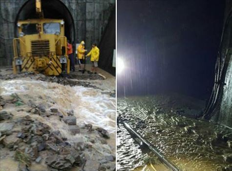 大雨釀禍!台鐵台東知本、太麻里間77公里處8日才發生土石流,列車煞車不及撞上,9日又發生路基流失約20幾公尺,目前交通中斷,正由台鐵工程搶修中,預估12時才能搶通路線。