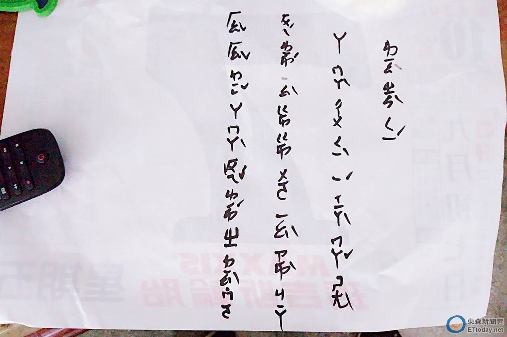 只見紙條寫道,「廖浚棋,阿嬤出去一下馬上回來,要乖乖喔、要在家好好等阿嬤回來,知道嗎」,雖然上面是注音符號,不過卻有「台灣國語」的腔調,像是「出ㄑ一ˋ 」、「好好ㄉ一ㄥˇ 阿嬤ㄏㄨㄟˇ 來」、「知ㄉ一ㄠˋ ㄇㄛ˙」。
