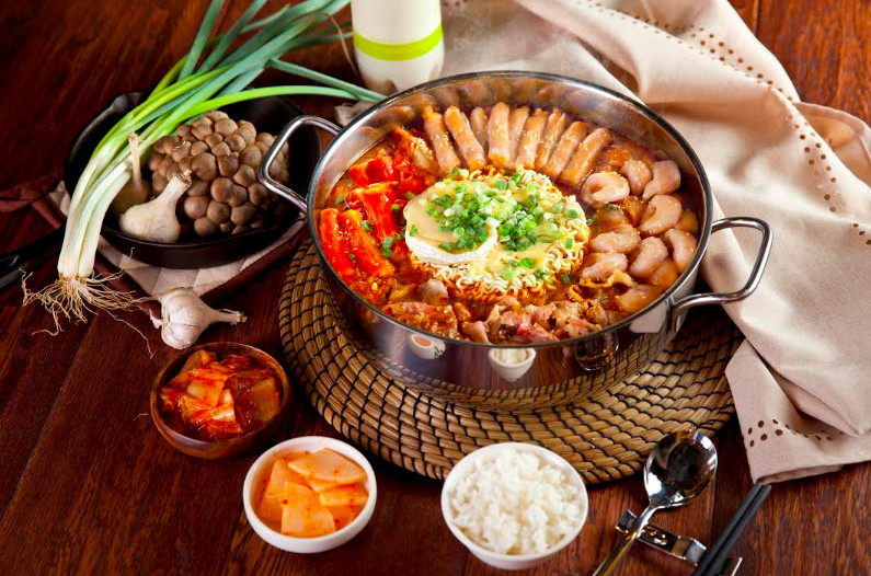 ▲吳秉承師傅示範韓式歐爸部隊鍋,營養豐富蔬菜、肉片與鮮味食材,當作宴客料理也很精緻澎湃。(圖/業者提供)