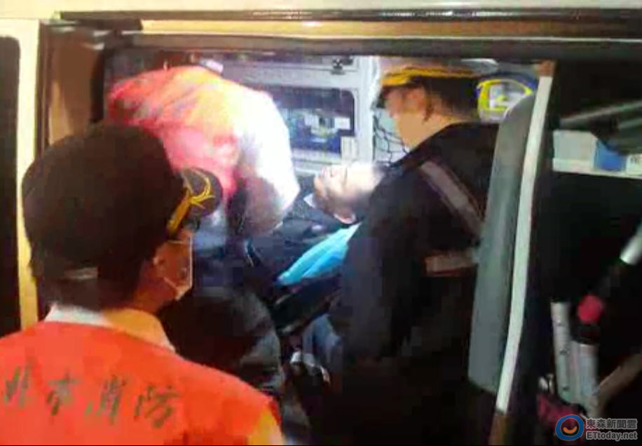 ▲一名負責交管的保一總隊員警遭女駕駛撞傷,被送上救護車。(圖/記者楊佩琪翻攝)