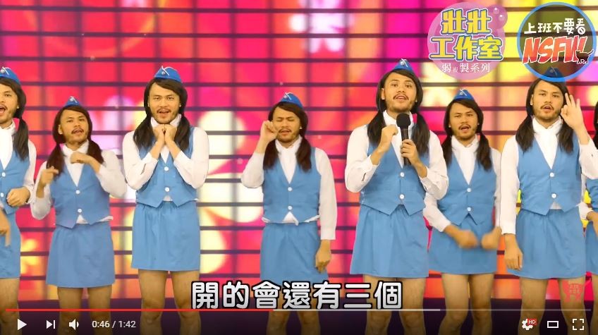 「上班不要看工作室」的《弱複製》系列又有新哏,這次他們模仿大陸女子團體GNZ48,由壯壯(陳彥壯)1人分飾多角成立「飛機杯緣子48」,將《我和我的祖國》改編成《我和我的二日週休》,加入近來民眾關心的「一例一休」議題,搞笑唱出勞工心聲,沒想到遭網友吐槽「音準太準了!」