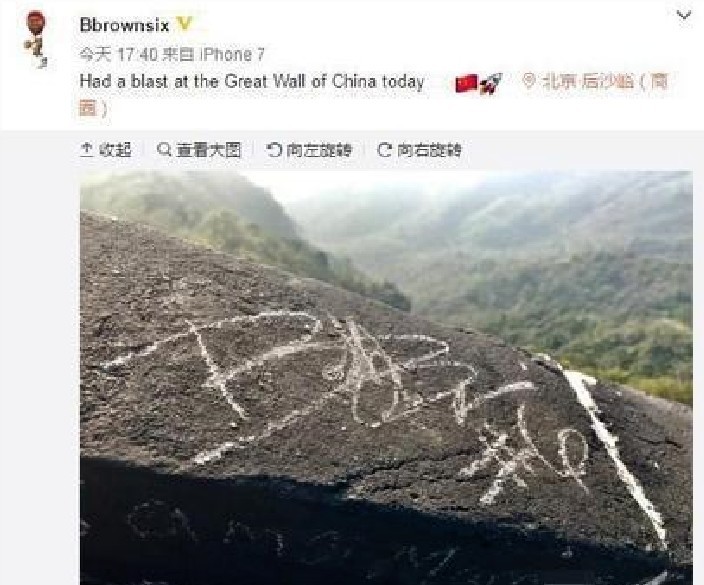 美國NBA鵜鶘與火箭兩隊近來到中國進行季前熱身賽,日前兩隊一同前往長城觀光時,現為火箭隊球員的布朗竟然在古蹟上刻下自己大名跟球衣號碼,還發文稱「今天在長城上盡情狂歡」,立即引來批評聲浪。