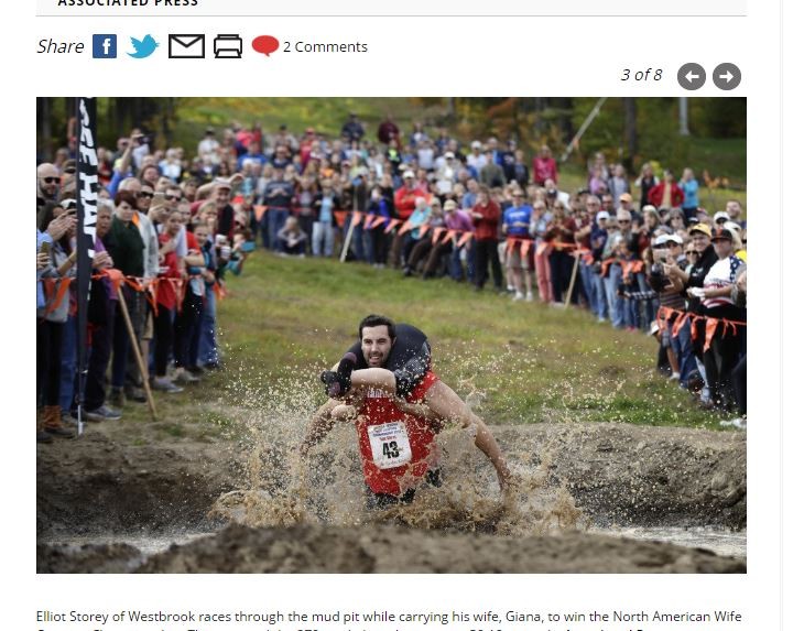 在歐美國家,有所謂的「背老婆大賽」,參賽男性必須扛起女生,突破重重障礙賽跑至終點。今年的「北美背老婆大賽」(North American Wife Carrying Championship)8日在緬因州盛大登場,最終由當地一對夫妻以59.18秒的成績,跑完254公尺長的賽道獲得冠軍,並抱走「與妻子等重的啤酒、以及妻子體重數5倍的現金」做為獎品。