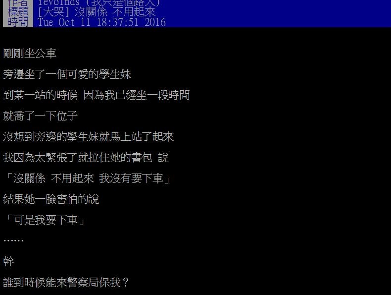 男網友11日PO文寫道「剛剛坐公車,旁邊坐了一個可愛的學生妹,到某一站時,因為我已經坐一段時間,就喬了一下位子......」這時旁邊的學生妹立刻站起來,讓他突然忍不住緊張拉住她的書包說「沒關係,不用起來,我沒有要下車。」結果對方一臉害怕地說「可是我要下車……」,讓他當場超尷尬「X!誰到時候能來警察局保我?」